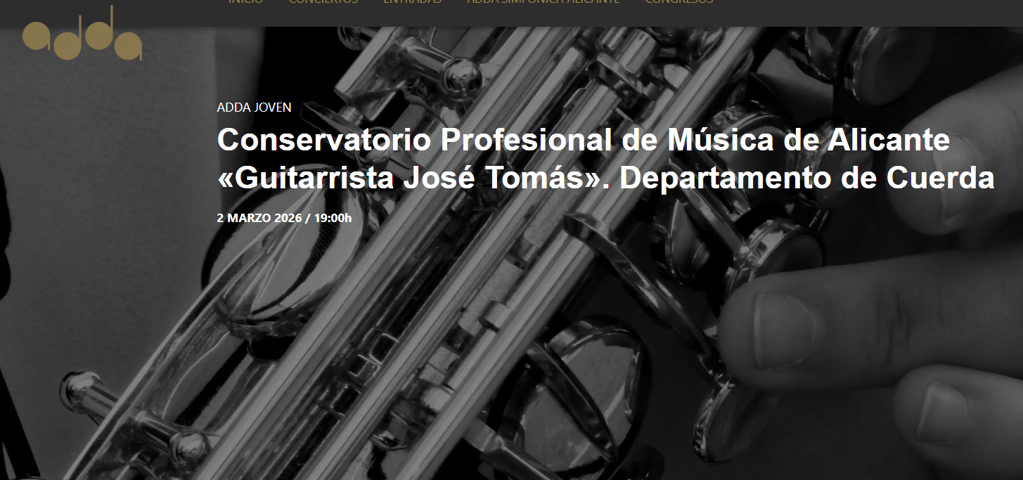 ADDA JOVEN. Conservatorio Profesional de Música de Alicante «Guitarrista José Tomás». Departamento de Cuerda març 2 ADDA JOVEN. Conservatorio Profesional de Música de Alicante «Guitarrista José Tomás». Departamento de Cuerda 7:00 PM - 8:30 PM