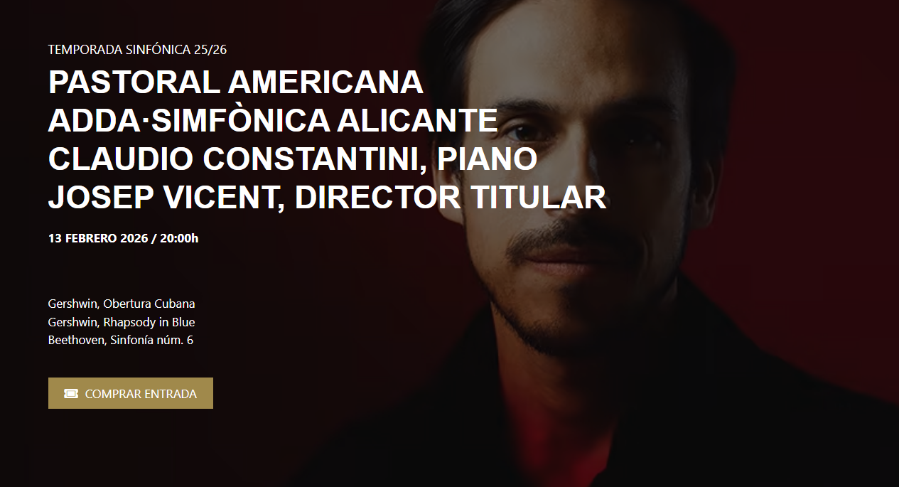 TEMPORADA SINFÓNICA 25/26. PASTORAL AMERICANA ADDA·SIMFÒNICA ALICANTE CLAUDIO CONSTANTINI, PIANO JOSEP VICENT, DIRECTOR TITULAR febr. 13 8:00 PM - 9:00 PM TEMPORADA SINFÓNICA 25/26. PASTORAL AMERICANA ADDA·SIMFÒNICA ALICANTE CLAUDIO CONSTANTINI, PIANO JOSEP VICENT, DIRECTOR TITULAR