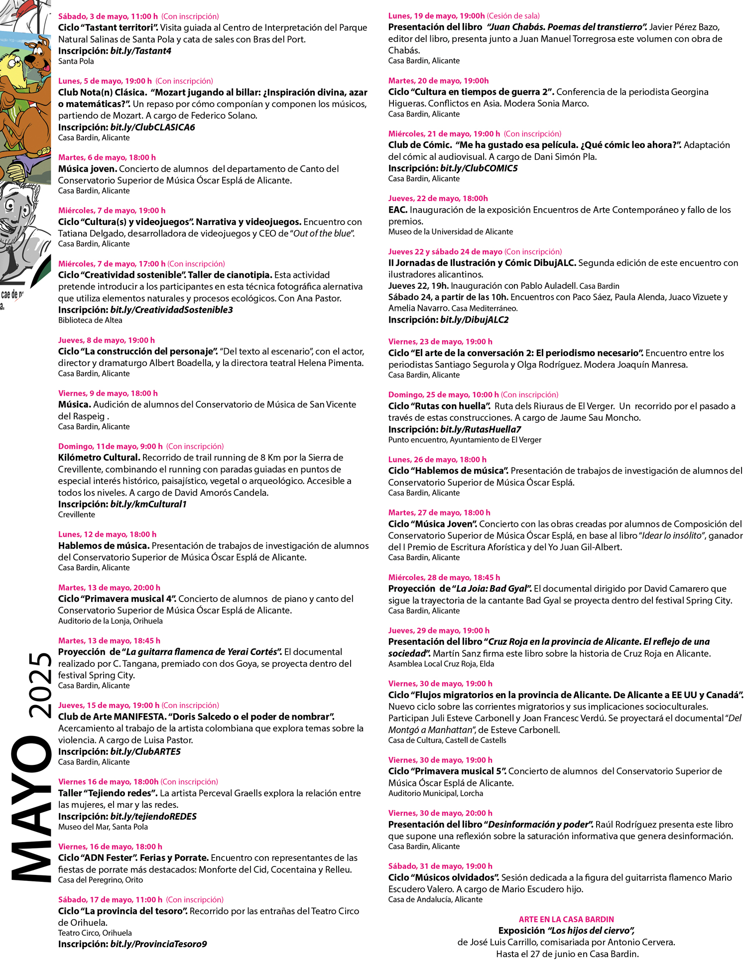 « Tots els Esdeveniments Aquest esdeveniment ja ha passat. Agenda mensual Instituto de Cultura Juan Gil Albert – Mayo 2025 3 maig / 9:00 AM - 31 maig / 8:00 PM « Primavera musical: Concierto de alumnos del CSMA en el Casino de Monóvar TASTANT TERRITORI: Visita y cata de sales gourmet en el parque Natural de las Salinas de Santa Pola » Descargar Descargar Afegeix al calendari Google Calendar iCalendar Outlook 365 Outlook Live Mostra els detalls Inici: 3 maig / 9:00 AM Finalització: 31 maig / 8:00 PM Categories d'Esdeveniment: Àrea de Cultura, Arte, Arte, Cine, Conferències, Excursiones, Fotografía, Gil Albert, Lectura, Mesa redonda, Música, Música, Poesia, Presentación de un libro, Rutas Guiadas, Talleres Lloc web: https://www.iacjuangilalbert.com/ Organitzador IAC Juan Gil Albert Telèfon 965 12 12 14 Correu electrònic galbert@diputacionalicante.es Visualitza el lloc web de Organitzador Recinte Instituto de Cultura Juan Gil Albert C. San Fernando, 44 Alicante, Alicante 03001 España + Mapa de Google Telèfon 965 12 12 14 Visualitza el lloc web de Recinte Related Esdeveniments ADDA JOVEN. ORQUESTA FILARMÓNICA Y CORAL DE LA UNIVERSIDAD DE ALICANTE, OFUA. CONCIERTO DE NAVIDAD. 17 desembre / 8:00 PM - 9:30 PM ADDA JOVEN. CONSERVATORIO SUPERIOR DE MÚSICA ÓSCAR ESPLÁ. CONCIERTO NAVIDAD / BANDA CSMA 18 desembre / 8:00 PM - 9:30 PM