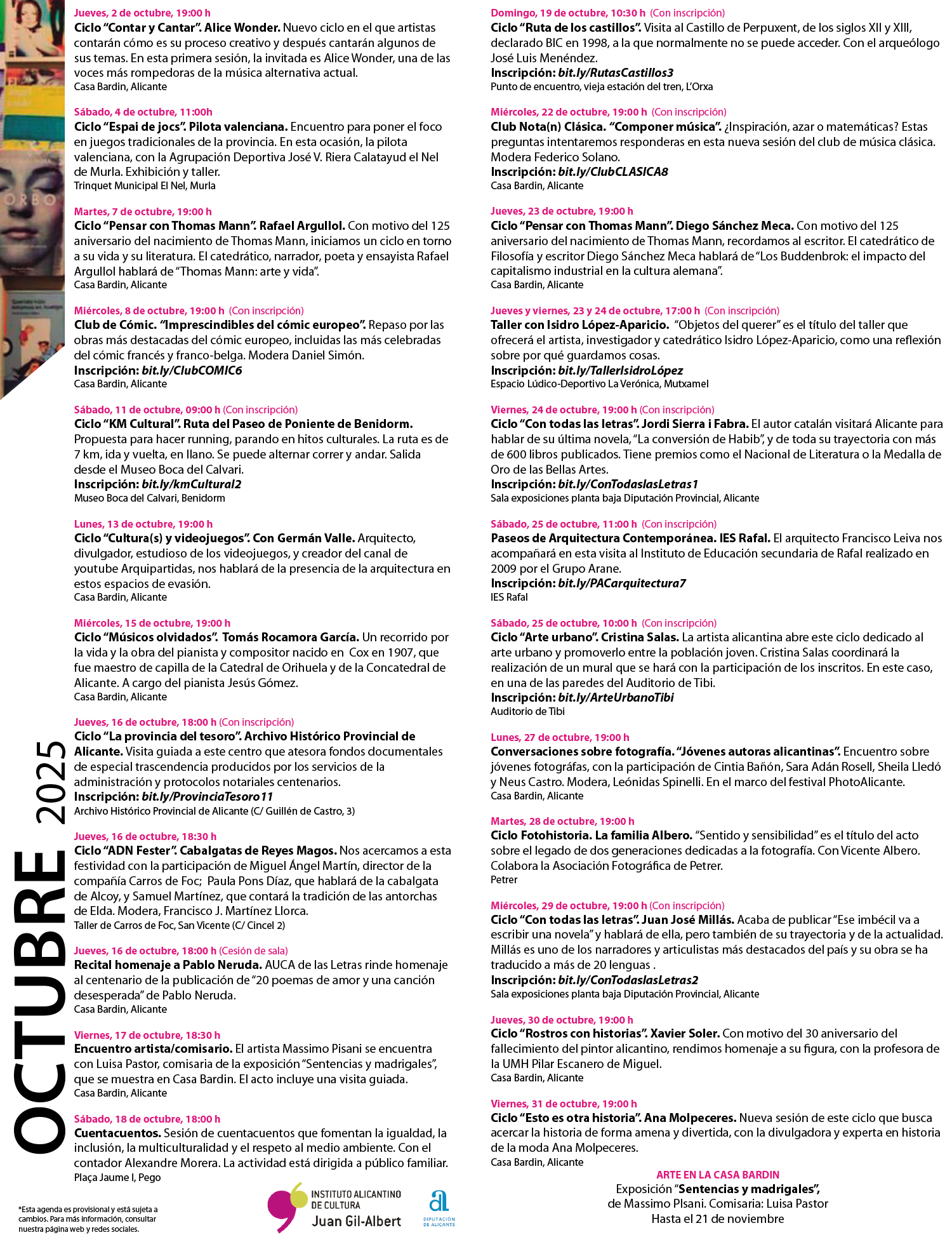 « Todos los Eventos Este evento ha pasado. Agenda mensual – Instituto de Cultura Juan Gil Albert Octubre 2025 1 octubre / 9:00 AM - 31 octubre / 8:00 PM « Exposición Lumen, entre el error y la forma de Adrián Muñoz Espouy » Descargar Progamación Descargar Progamación Añadir al calendario Google Calendar iCalendar Outlook 365 Outlook Live Detalles Comienza: 1 octubre / 9:00 AM Finaliza: 31 octubre / 8:00 PM Categorías del Evento: Arte, Exposiciones, Fotografía, Lectura, Música, Pintura, Poesia, Rutas Guiadas, Visitas guiadas Web: https://www.iacjuangilalbert.com/ Organizador IAC Juan Gil Albert Teléfono 965 12 12 14 Correo electrónico galbert@diputacionalicante.es Ver la web del Organizador Local Instituto de Cultura Juan Gil Albert C. San Fernando, 44 Alicante, Alicante 03001 España + Google Map Teléfono 965 12 12 14 Ver la web del Local Eventos Relacionados ADDA JOVEN Intercentros Melómano – Premio de Interpretación para Solistas 7 diciembre / 12:00 PM - 1:00 PM ADDA JOVEN Intercentros Melómano – Premio de Interpretación para Solistas 7 diciembre / 5:00 PM - 6:00 PM ADDA JOVEN Intercentros Melómano – Premio de Interpretación para Solistas 7 diciembre / 7:00 PM - 8:00 PM