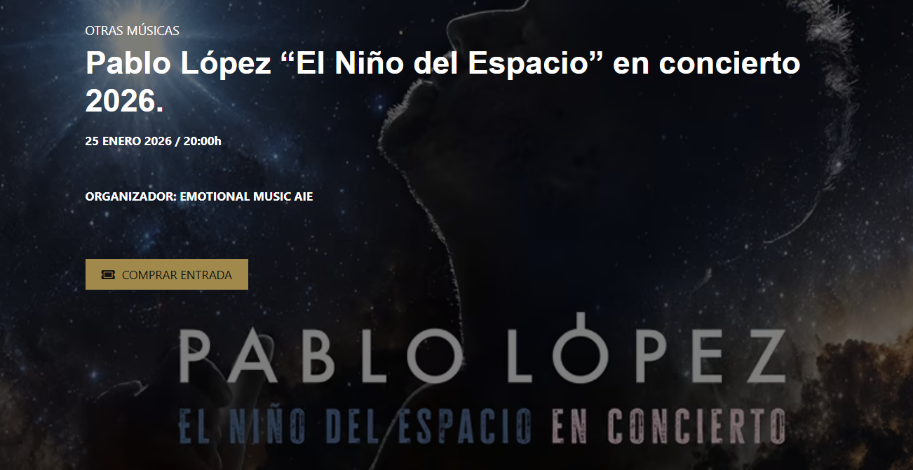 Ene 25 8:00 AM - 9:30 PM OTRAS MÚSICAS. Pablo López “El Niño del Espacio” en concierto 2026. ADDA Paseo Campoamor S/N, Alicante Detalles de Evento Cómo llegar